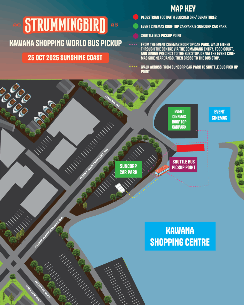We can’t wait to welcome you to Strummingbird on the Sunny Coast. Chances are, the time you’re planning to arrive and leave will be a similar time to everyone else. To make your day as cruisy as possible, make sure you’re across the best ways to get to and from the festival below (we recommend jumping on the free shuttle buses, so ya know).